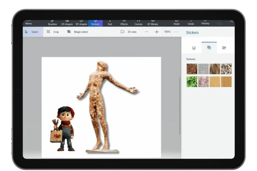 You can decorative graphics, textures, and patterns to your artwork. Stickers can be applied to both 2D images and 3D models, making it easy to add color, detail, and personality to your designs. Stickers are small graphic elements that can be placed on the canvas or directly on 3D objects. They are available in different shapes, colors, and styles, helping you make your project more creative and visually appealing.